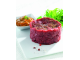 Viande hachée surgelée de bœuf tartare et sa dosette de sauce surgelée. Couche mince de viande sous vide surgelée