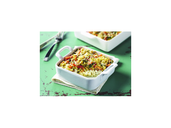 Poêlée de légumes et boulgour cuite enrobée d'une sauce surgelée.