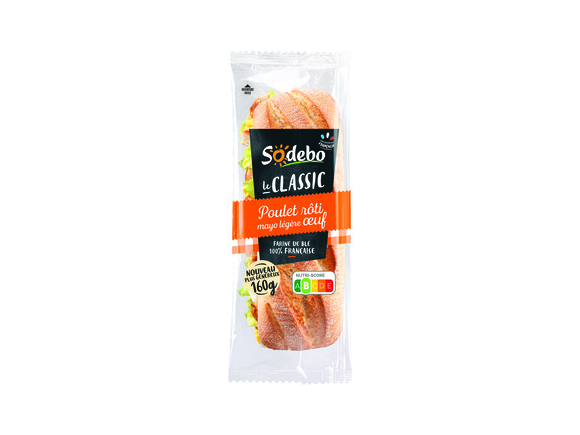 Sandwich composé de 52% de baguette garni de 17% de poulet rôti traité en salaison, 11% de mayonnaise allégée en
