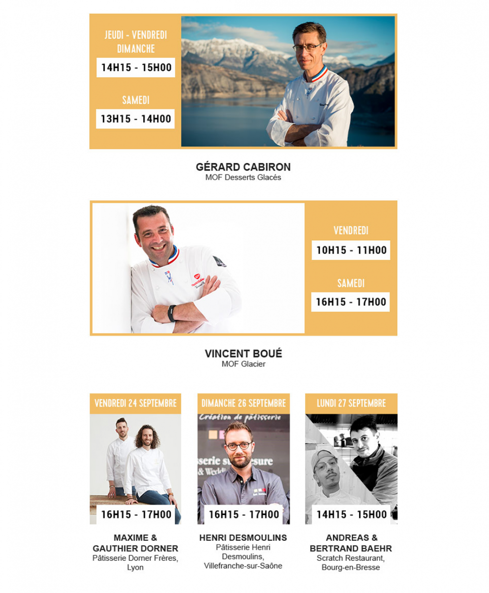 par des chefs pâtissiers de renom ainsi que deux Meilleurs Ouvriers de France Glacier et Desserts Glacés, présents chaque jour sur notre Scène !