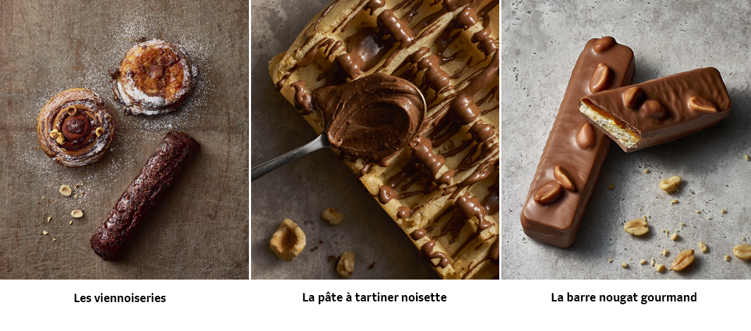 - Pâte à tartiner noisette : "Encore plus de gourmandise en alliant praliné, gianduja et pâte de cacao."