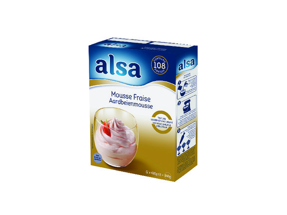 Mode d¿emploi : verser l'eau froide (0 à 3°C) dans la cuve d'un batteur. Incorporer la préparation déshydratée pour Mousse Fraise Alsa dans l'eau. Monter au batteur 2 minutes à petite vitesse puis 5 minutes à vitesse maximale. Dresser à la poche dans les coupes et réserver au frais au moins 90 minutes