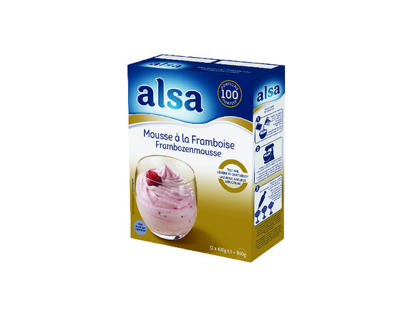Mode d¿emploi : verser l¿eau froide (0 à 3°C) dans la cuve d'un batteur. Incorporer la préparation pour Mousse Framboise Alsa dans l¿eau. Monter au batteur à petite vitesse pendant 2 minutes, puis à vitesse maximale pendant 5 minutes. Dresser à la poche dans des coupes. Réserver au frais pendant au moins 90 minutes.