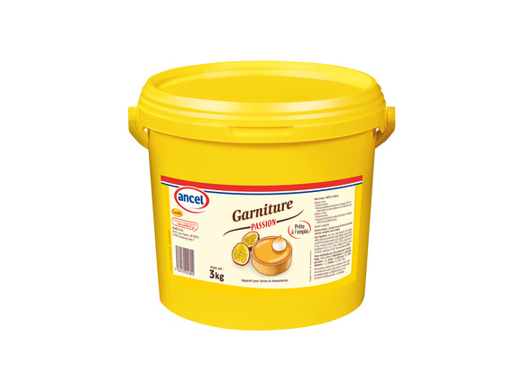 Garniture au jus de fruit de la passion concentré, aromatisée, prête à l'emploi.