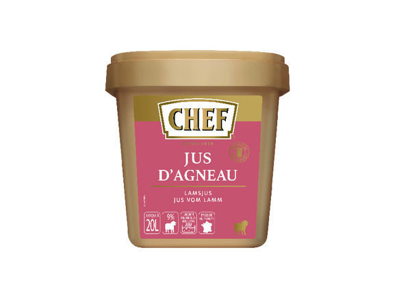La garantie CHEF® : une sélection rigoureuse des ingrédients ; une excellente tenue en liaison froide et au bain-marie . Sans exhausteur de goût ajouté , sans colorant artificiel, sans conservateur. Un bordereau de traçabilité détachable et recollable ; une boîte service pratique, hermétique et empilable. Jus d'Agneau : une recette puissante et riche en goût (9% de viande d'Agneau). L'alliance subtile entre une note rôtie incisive et la finesse du goût de la viande d'Agneau.