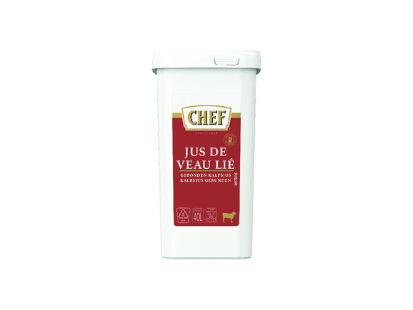 À très faible teneur en matières grasses tel que préparé. Issu du savoir-faire CHEF® : une sélection rigoureuse des ingrédients ; des dosages adaptés aux différents types d'utilisation (cuissons, sauces) ; une excellente tenue en liaison froide et au bain-marie ; un bordereau de traçabilité détachable et recollable. Un conditionnement pratique, hermétique, refermable, empilable et recyclable. Le Jus de Veau Lié CHEF® : la référence du marché depuis 1976. Un subtil équilibre des saveurs entre la viande de veau et la garniture aromatique vous assurant efficacité et puissance en recette.