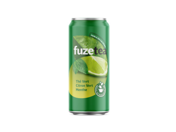 Boisson rafraîchissante aux extraits de thé vert et de menthe, saveur menthe et citron vert, avec sucre et édulcorant.