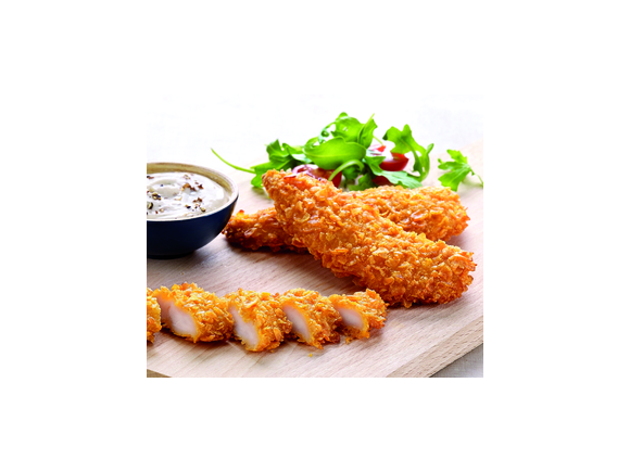 Aiguillettes de poulet traitées en salaison 76%, enrobée de corn flakes 24%, cuites, frites et surgelées.
