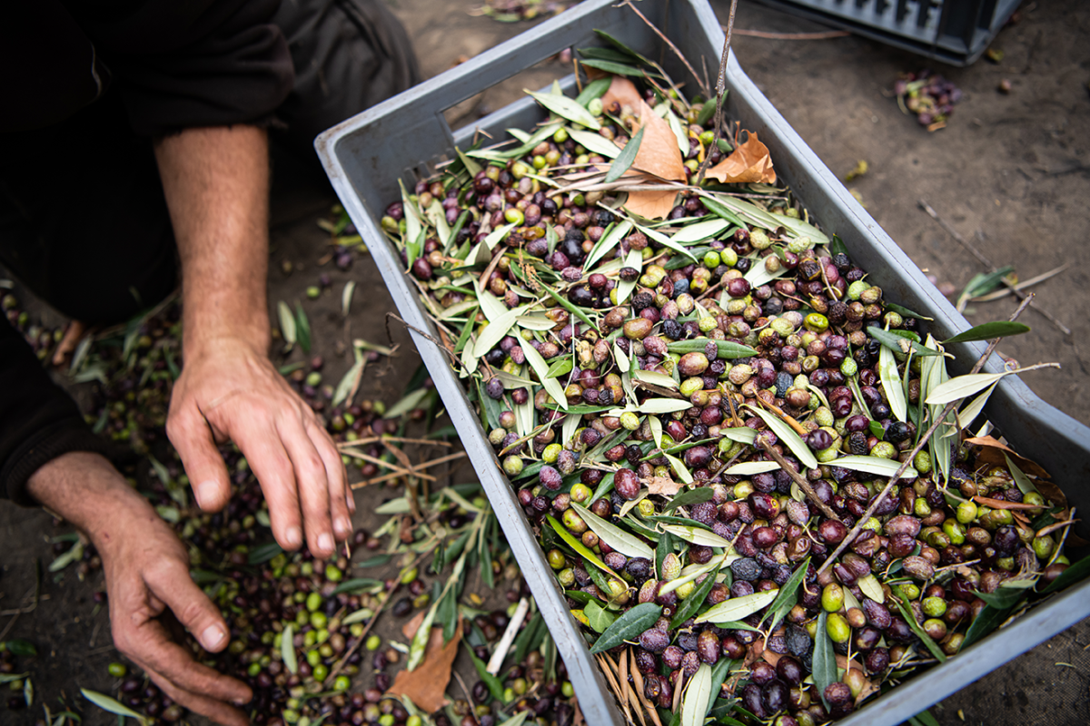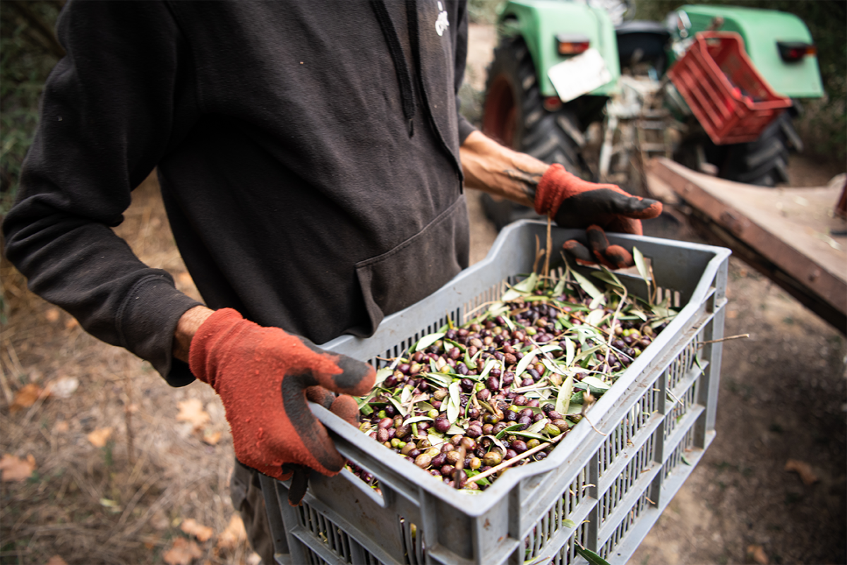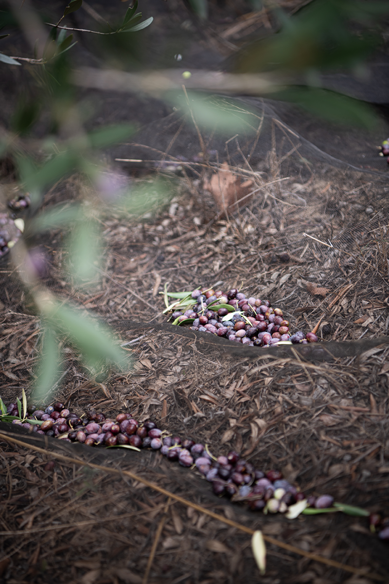 En ce milieu d'automne, est venu le temps de la cueillette. Ils sont déjà là, les 7 journaliers, venus de toute la France avec tente ou camping-car, qu'ils posent çà et là sur l'oliveraie pour les 7 semaines que prendra la récolte. Dès l'aube, armés d'un peigne vibrant poussé à bout de bras, les cueilleurs passent dans les oliviers plantés en gobelet à 7 mètres les uns des autres, jusqu'à leur sommet. Ils sont rapides, l’œil vif, repérant les tâches noires à chasser. Les olives, semblables à de petites cerises vert tendre, mauves ou noires, mêlées de feuilles, s’amoncèlent dans les grands filets sombres tendus au pied des arbres. Lorsque les végétaux sont peignés, l'un des ramasseurs, une extrémité du filet tenue dans chaque main posée sur l’épaule correspondante, avance avec sa cape de super héros. Méthodique il tire les filets pour ramener les fruits sur la toile suivante et étendre le filin vide à sa suite, ainsi jusqu'au bout de l'allée. Les ramasseurs versent la récolte dans des caisses qui s'amoncellent peu à peu sur le tracteur. Puis la cargaison est conduite au mas pour être triturée, c’est-à-dire pressée, dans la foulée.