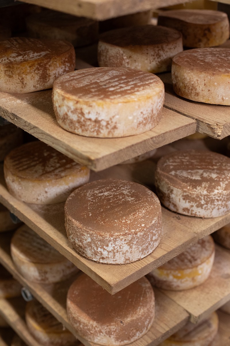La Tomme de Normandie est ensuite affinée pendant 4 à 6 mois sur des planches d’épicéa non traité. Ce bois particulier absorbe l'humidité tout en permettant au fromage de respirer, développant ainsi ses arômes fruités et sa texture onctueuse. « Chaque fromage est retourné et brossé manuellement, c’est un travail de précision et de passion », explique Franck. Cet affinage prolongé confère à la Tomme des saveurs complexes, mêlant des notes riches et suaves, offrant une expérience gustative inégalée.