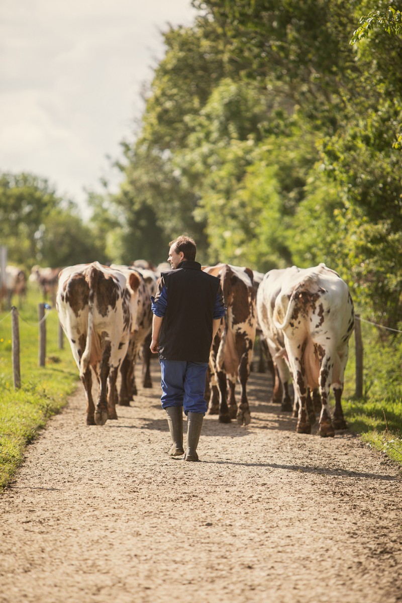 Les vaches normandes, reconnaissables à leur robe fauve tachetée de blanc, sont élevées dans le respect de la tradition. Elles sont robustes et douces, adaptées au climat de la région et produisent l’un des laits les plus riches en matière grasse et en protéines, essentiels pour la fabrication de la Tomme de Normandie. Arnaud veille sur elles avec une attention particulière, assurant leur bien-être grâce à des pratiques respectueuses de l'environnement. De fin mars à novembre, ses vaches paissent en toute liberté, savourant la diversité des prairies.