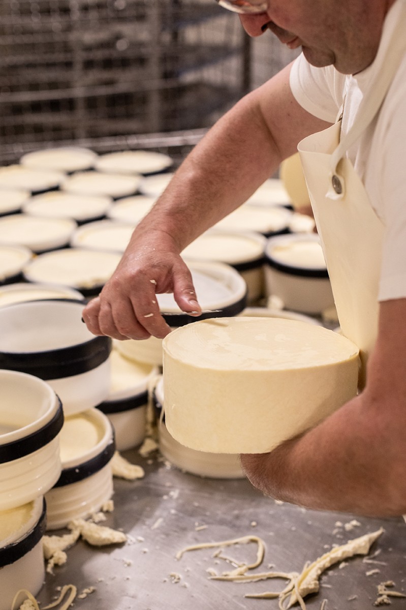 Une fois les grains soigneusement découpés à la bonne dimension, vient la phase de délactosage puis d’égalisage. Pour chacune de ces étapes, différents employés artisans ont été sélectionnés pour leur expertise et leur excellence dans chacun de ces gestes. Les grains sont ensuite moulés à la main puis pressés. Le bain de saumure de dix heures va venir parfaire l’assaisonnement des fromages, renforcer leur structure et favoriser la formation de la croûte.