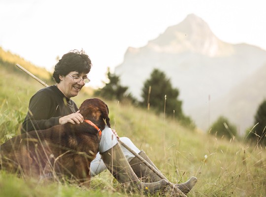 Il est bientôt 6h, l'heure de la traite. C'est Sylvie qui est chargée de rassembler le troupeau. Armée de son bâton, et accompagnée de son fidèle basset des Alpes, Gamma, elle dévale la prairie. « Allez, allez ! »